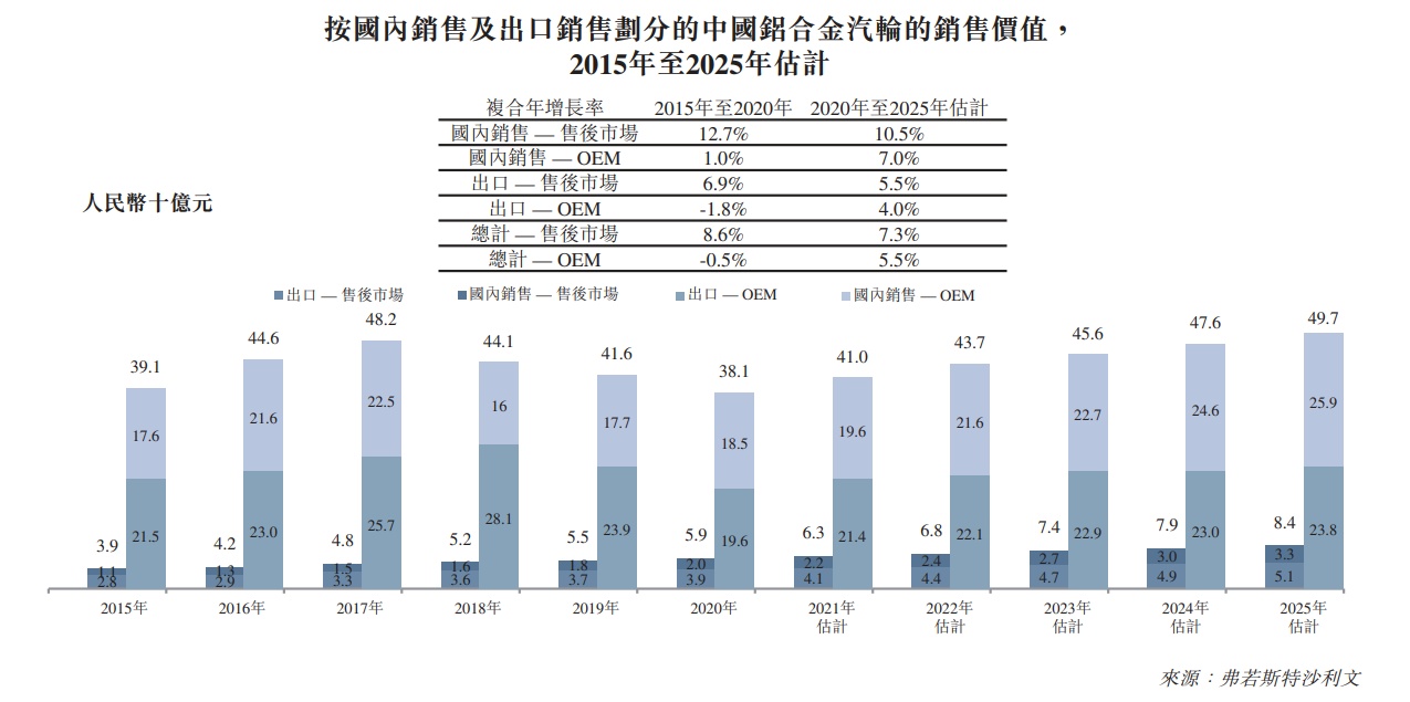 基于上述逻辑,弗若斯特沙利文预测从2020年至2025年,国内后装市场对铝合金汽轮的需求的年复合增速为10.5%,同期出口的后装市场的需求年复合增速为5.5%。国内市场虽相较出口增速更快,但市场将加速向头部集中,出口增速虽不及国内市场,但庞大规模下拥有更多结构性机会。