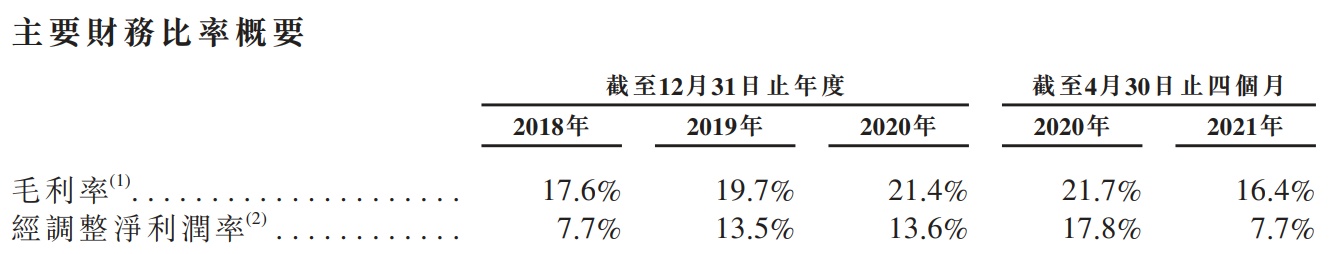 在最新的招股材料中,公司的最新业绩浮出水面:其2021年前四个月的收入为1.23亿人民币,同比大增88.74%,复苏趋势明显;但由于上游铝合金成本的上升,期内净利润仅增长12.27%至704.5万人民币。