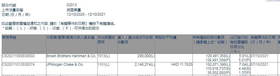 智通财经APP获悉,香港联交所最新资料显示,10月7日,小摩增持微盟集团(02013)214.6274万股,每股作价11.7820港元,总金额约为2528.74万港元。增持后最新持股数目约为1.82亿股,最新持股比例为7.04%。