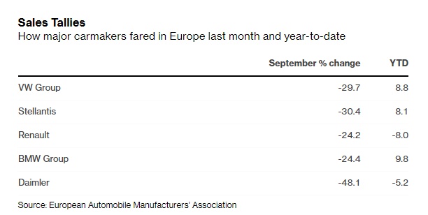 9月份欧洲所有主要市场都出现了两位数的下滑,其中英国和意大利的销量下降了约三分之一。