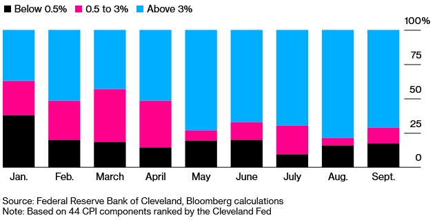 第一波大范围通货膨胀仅限于相对较小的商品和服务类别,然而克利夫兰联储表示,现在情况已经不同了。其研究人员发现,近几个月来,CPI的44个主要组成部分中,约有四分之三的涨幅超过3%;相比之下,今年年初这一数字只有不到三分之一。