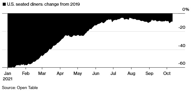 作为服务业中最具代表性的餐馆,由于Delta变种病毒在夏季的蔓延阻碍了外出就餐这一趋势的复苏,目前的就餐水平低于疫情前的正常水平。