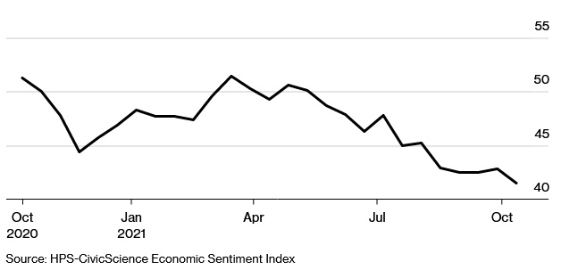 小企业主的情绪在9月份变得消极,预计未来六个月商业环境将好转的人数降至2012年12月以来的最低水平。Chief Executive杂志编制的一项首席执行官信心指数也连续三个月下降,抹去了2021年早些时候该指数的所有涨幅。