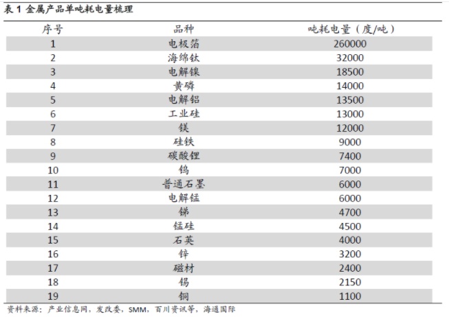 一、主流金属产品单吨耗电量梳理。本章我们梳理了19种主流金属产品的单吨耗电量情况,从单吨产品耗电量角度看,我们认为像是电极箔、海绵钛、电解镍、黄磷等产品的单吨耗电量更大,像是电极箔单吨耗电可高达26万度电。当然从纯金属产品角度看,镍、铝、硅、镁等产品的单吨耗电较大,分别均在每吨1.2万度电以上,我们认为均属于高耗能行业。