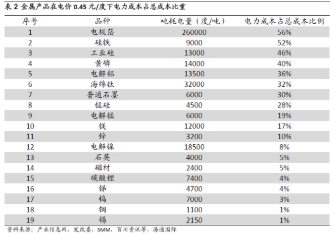 根据我们的分析,我们发现电极箔、硅铁、工业硅、黄磷等品种对于电力成本可能更为敏感,0.45元/度的电价对应成本已在其总成本中占比超40%,而对于锡、铜、钨、锑、碳酸锂等品种电力涨价带来的变动基本则可以忽略不计,电力成本占比低于5%。