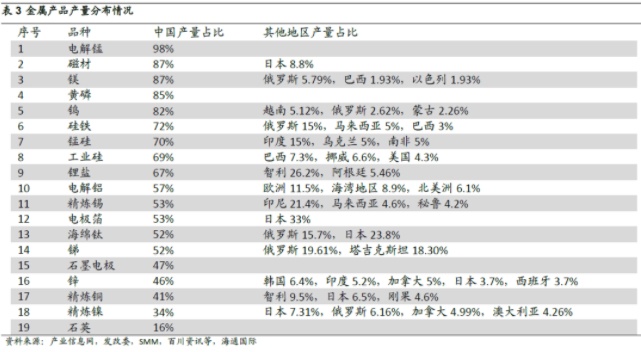 从数据上看,锰、磁材、镁、黄磷、钨等品种的占比最高,均在全球80%以上,一旦国内限产加剧,这些品种的价格可能更具弹性。