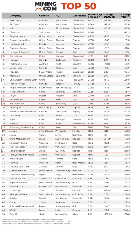 造成这种状况的原因为铁矿石暴跌等引发的大型企业抛售行为,榜单中虽然必和必拓(BHP.US)、力拓(RIO.US)、淡水河谷(VALE.US)仍占据前三,但其总市值在第三季度均有30%左右的大幅下跌。而受益于电动汽车领域发展、能源价格上涨,中国矿企整体表现出色。