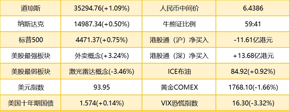 1. 隔夜美股截至收盘,道指涨382.20点或1.09%,报35294.76点;纳指涨73.91点或0.50%,报14897.34点;标普500指数涨33.11点或0.75%,报4471.37点。上周道指上涨1.58%,纳指上涨2.18%,标普500指数上涨1.82%。 港股ADR指数上涨,按比例计算,收报25456点,涨125.99点或0.49%。
