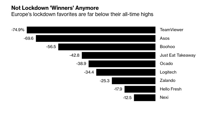 对于那些在疫情封锁期间获得提振的公司来说,现在的限制已经放款,到了进行现实核查的时候了。由于商业客户需求疲软,远程连接平台TeamViewer(TMVWY.US)下调了预期,之后,该公司股价在一天之内下跌了25%。在线外卖公司Just Eat takeaway.com(GRUB.US)是另一家受害者,该公司在发布订单增长放缓的消息后,股价出现下滑。
