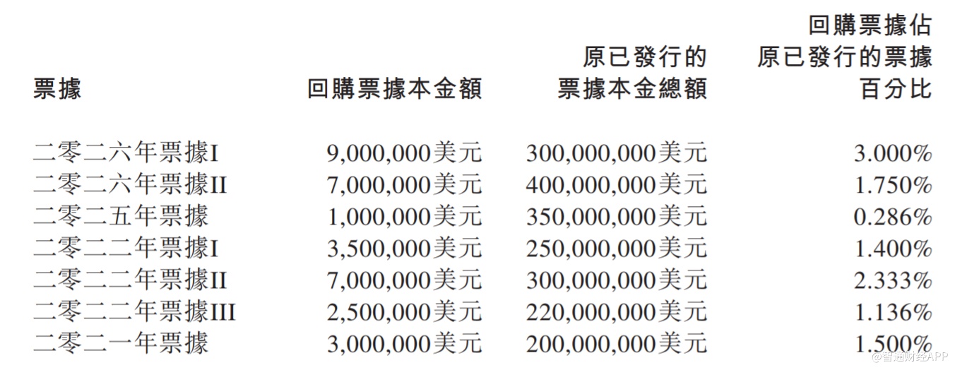 详细来看,7个票据均有不同程度的回购。其中,年息6.7%于2026年到期的3亿美金优先票据回购最多,回购票据占原发行票据的比例达到了3%。而7个票据的总回购金额为3300万美元。