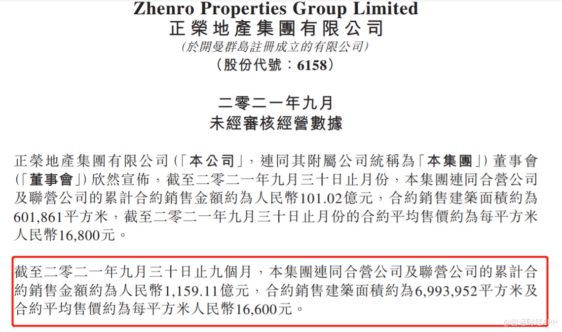 而正荣地产的优质除了体现在财务结构的稳健外,合约销售数据亦是体现公司内在价值的亮点。智通财经APP了解到,2021年1至9月内,正荣地产连同合营公司及联营公司的累计合约销售金额约为1159.11亿元,同比增长20.55%,合约销售建筑面积约为699.4万平方米,同比增长13.94%,每平方米的平均售价约为1.66万元,同比增长5.73%。