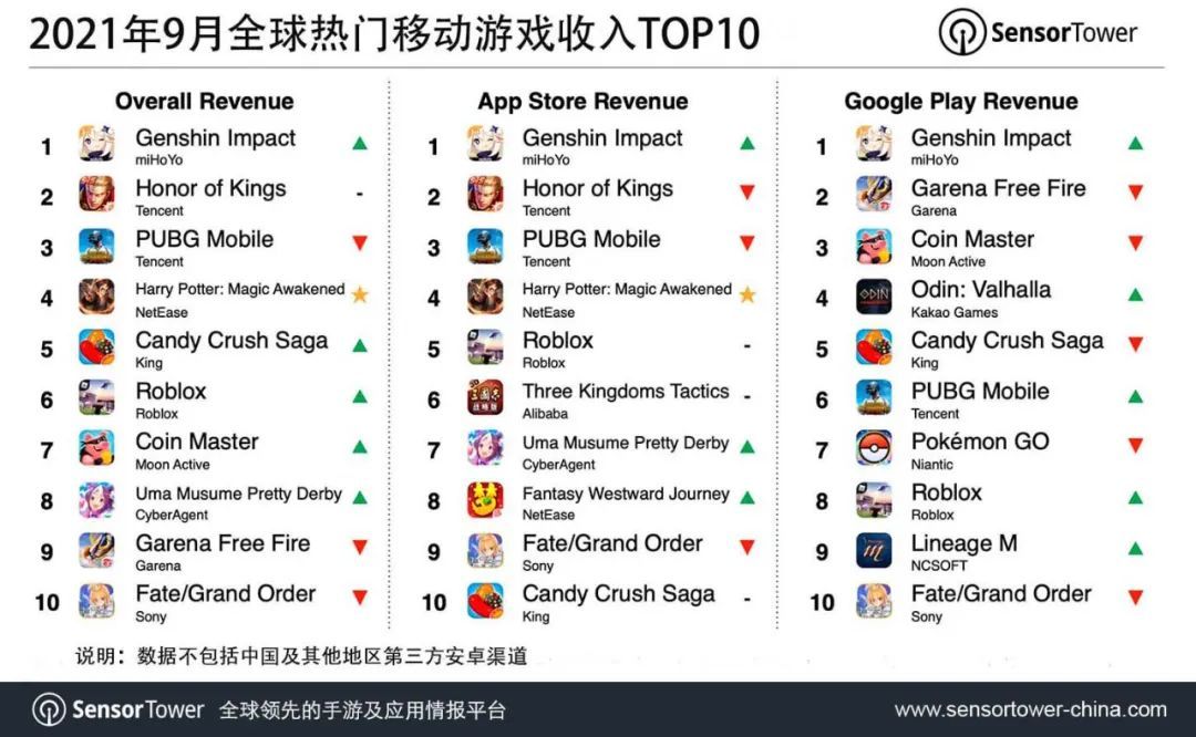 榜单前五另外三款游戏为腾讯《PUBG Mobile》(合并《和平精英》收入)、网易(09999)《哈利波特:魔法觉醒》和King《Candy Crush Saga》。