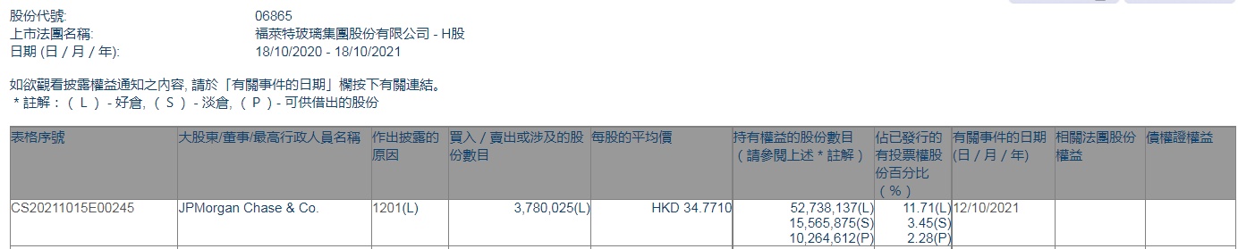 智通财经APP获悉,香港联交所最新资料显示,10月12日,小摩减持福莱特玻璃(06865)约378万股,每股作价34.771港元,总金额约为1.31亿港元。减持后最新持股数目约为5273.81万股,最新持股比例为11.71%。