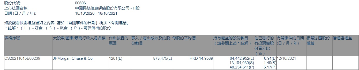 智通财经APP获悉,香港联交所最新资料显示,10月12日,小摩减持中国民航信息网络(00696)约87.35万股,每股作价14.9539港元,总金额约为1306.2万港元。减持后最新持股数目约为6444.3万股,最新持股比例为6.91%。