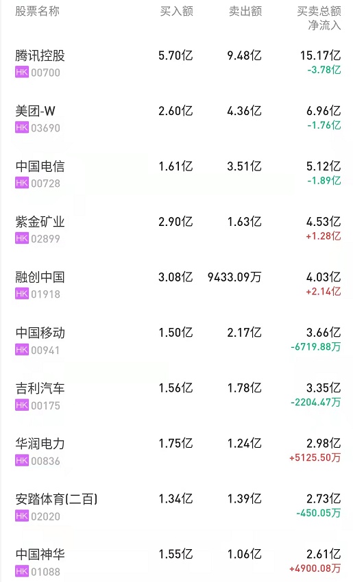 此外,美团-W(03690)、中海油(00883)分别获净买入4724万、3732万港元。而中国电信(00728)、中国移动(00941)分别遭净卖出1.89亿、6719万港元。