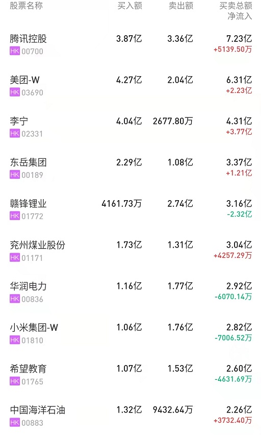 东岳集团(00189)获净买入1.21亿港元。消息面上,港交所权益资料显示,10月12日,东岳集团获执行董事、副总裁兼首席财务官张哲峰增持10万股,每股平均价14.72港元,涉资约147.20万港元。此外,瑞信日前研报指,公司受内地化工行业负面情绪及限电忧虑夹击,上月股价大幅回调。按该行与公司沟通所得,除氯甲烷业务外,东岳营运正常,至今未受到任何限产影响。维持“跑赢大市”评级。