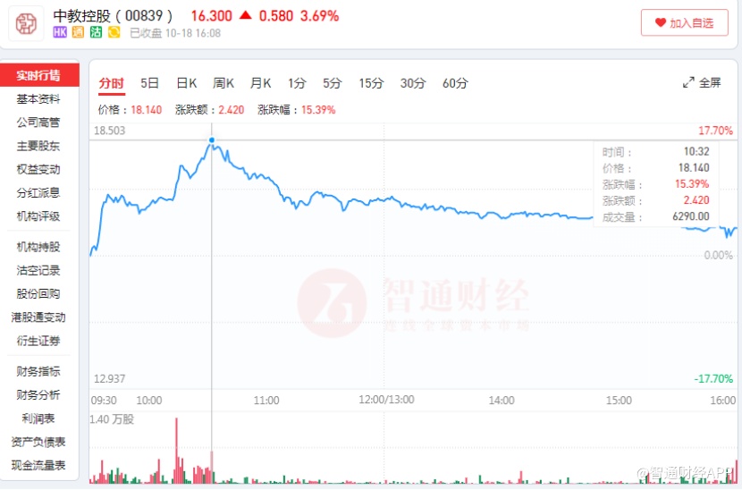 此次政策内容到核心目标无疑将为国内职业教育的发展注入强大的动能。受政策激励,港股教育股近日持续走高。10月18日,多家教育股公司早盘大涨。以中教控股(00839)为例,公司早盘高开高走,盘中最高涨幅一度达到15.39%。而宇华教育(06169)更是一路高歌,盘中涨幅超20%,股价一度超过每股5港元。