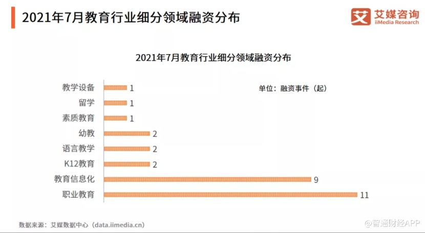 据统计,今年7月融资事件细分领域中,职业教育融资数量为11起,居于细分领域榜首;教育信息化以9起的数额排在第二位。K12教育、语言教育、幼教领域融资数量各为2起,而留学、素质教育、教学设备领域融资数量各为1起。