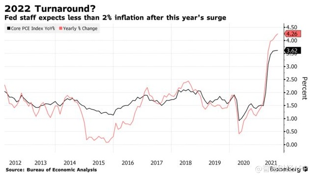 会议纪要中的预测概要表示:“供应问题对消费价格的提振预计将部分逆转,进口价格预计将大幅减速。因此,预计到2022年PCE价格通胀将回落至略低于2%的水平。”内部分析人士还补充说,通胀风险是上行的。