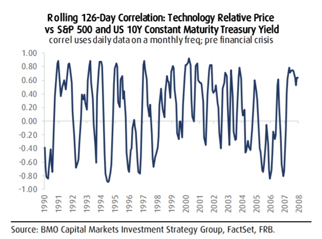 为了衡量长期关系,BMO考察了高科技指数ETF-SPDR(XLK.US)相对于标普500指数的价格和10年期美国国债收益率之间的126天滚动相关性。