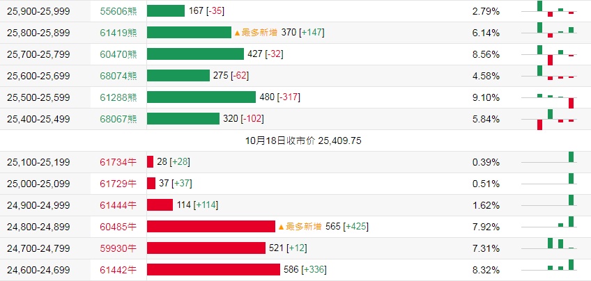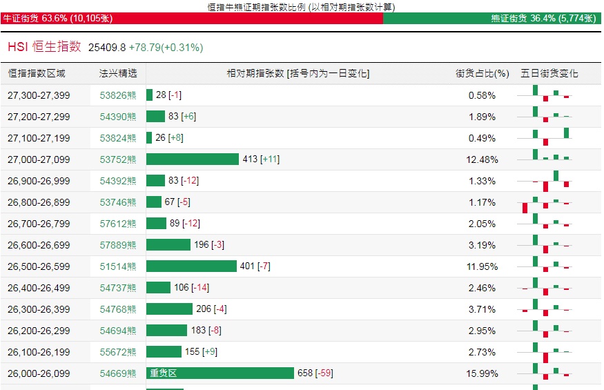 法兴恒指牛熊证街货分布图中的数据显示,熊证街货重货区在26,000-26,099区间,该区间最新熊证数量为658张,较上一交易日减少59张;最多新增在25,800-25899区间,该区间最新熊证数量为370张,较上一交易日增加147张。