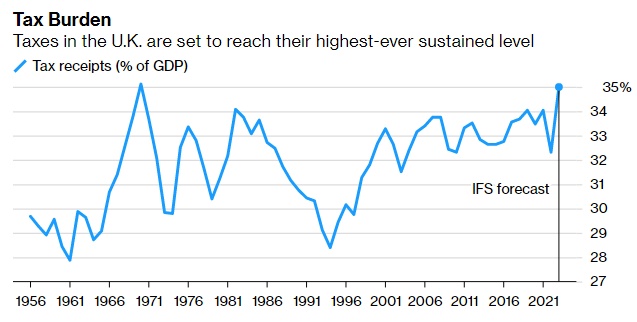 但英国目前的现状却大大相反。约翰逊的保守党政府准备将税收负担占国民收入的比例提高到35%,财政研究所(Institute for Fiscal Studies)表示,这将是1955年以来的最高水平。