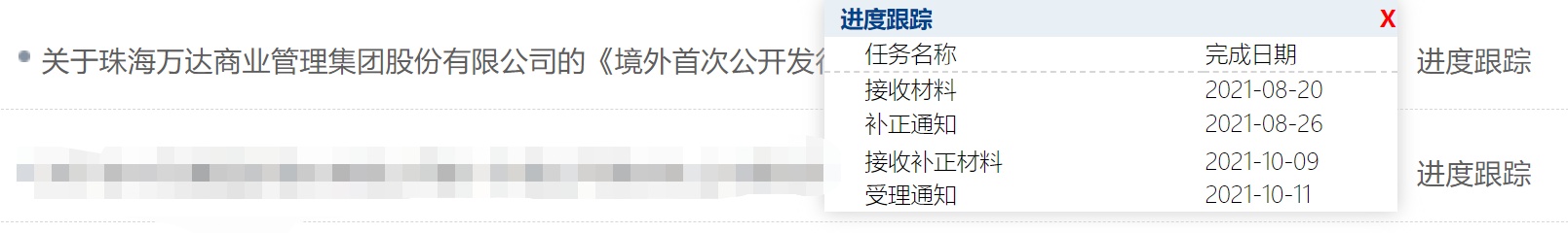 中国证监会国际部于8月20日,接收万达商管的审批材料、8月26日出具补正通知、10月9日接收补正材料,10月11日发出受理通知,即关于珠海万达商业管理集团股份有限公司的《境外首次公开发行股份(包括普通股、优先股等各类股票及股票的派生形式)审批》最终获得证监会受理。