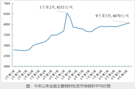 9月份,钢材价格持续上行。据我中心监测数据,9月全国主要钢材批发市场钢材平均价格在高位连续小幅上行,第5周钢材价格为6070元/吨,较8月底价格上涨182元,涨幅为3.1%,高于去年同期43%。