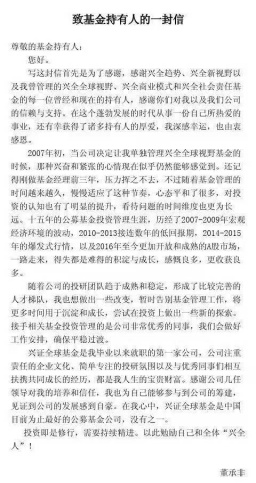 信中,董承非还表达了对公司的感恩之情,并对自己十五年的投资生涯作出回顾,最后他写到:“兴证全球基金是我毕业以来就职的第一家公司,公司注重责任的企业文化、简单专注的投研氛围以及与优秀同事们相互扶携共同成长的经历,都是我人生的宝贵财富。感谢公司几任领导对我的培养和信任,我也为自己能够参与到公司的筹建,见证到公司的发展感到自豪。在我心中,兴证全球基金是中国目前为止最好的公募基金公司,没有之一。投资即是修行,需要持续精进。以此勉励自己和全体‘兴全人’!”