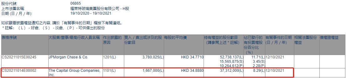 智通财经APP获悉,香港联交所最新资料显示,10月12日,The Capital Group Companies, Inc.增持福莱特玻璃(06865)166.7万股,每股作价34.8880港元,总金额约为5815.83万港元。增持后最新持股数目为3731.2万股,最新持股比例为8.29%。