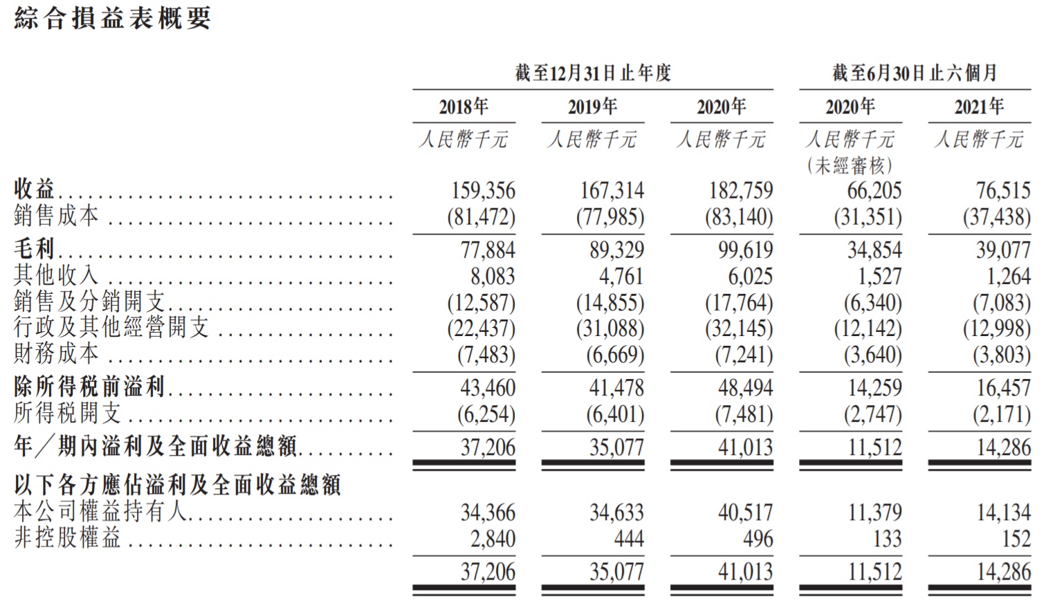 截至2021年6月30日止六個月,公司的收益由去年的6620.5万元增加至7651.5万元(人民币,下同),整体毛利由3485.4万元增加至3907.7万元,期内溢利及全面收益总额由1151.2万元增加24.3%至1428.6万元。