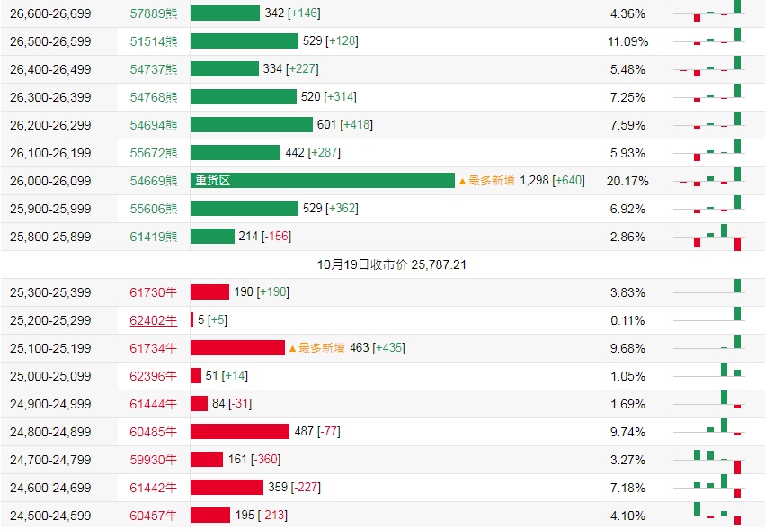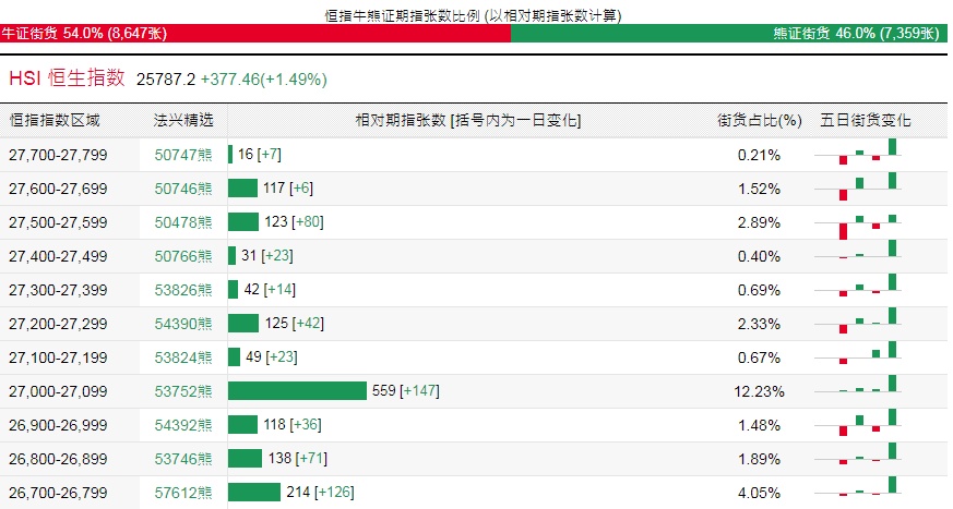 法兴恒指牛熊证街货分布图中的数据显示,熊证街货重货区在26,000-26,099区间,该区间最新熊证数量为1298张,较上一交易日增加640张;最多新增在相同区间。