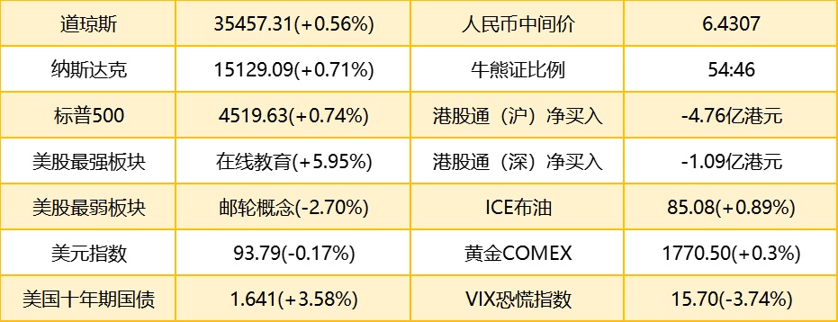 1. 隔夜美股截至收盘,道指涨198.70点或0.56%,报35457.31点;纳指涨107.28点或0.71%,报15129.09点;标普500指数涨33.17点或0.74%,报4519.63点。10年期美国国债收益率触及6月初以来最高水准1.6302%,市场人士越来越预期美联储将很快开始缩减资产购买计划,财报季迄今表现令人鼓舞,且近期数据显示美国消费者物价强劲上升。港股ADR指数上涨,按比例计算,收报26130点,涨343.29点或1.31%。