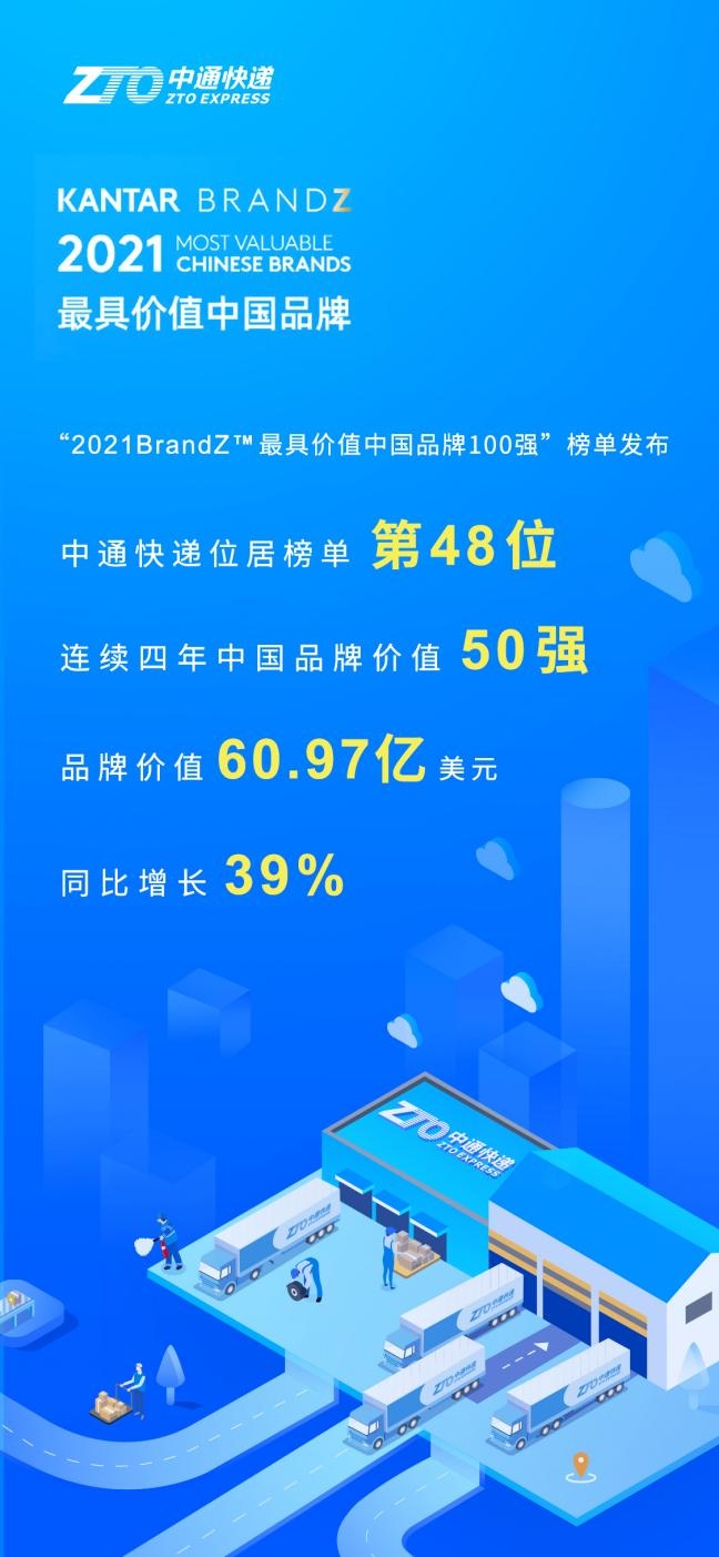 智通财经APP获悉,10月18日,“2021年BrandZ™最具价值中国品牌100强”榜单发布,其中,中通快递(02057)位居榜单第48位,品牌价值达60.97亿美元,较去年同比增长39%,这是中通快递自2018年来连续四年入围50强。在全球疫情的大背景下,中通仍实现了品牌价值39%的大幅提升,展示了强大的品牌韧性。