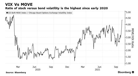 另外,从VIX指数和衡量美国国债波动率的MOVE指数的比率中可以看出,股市和债市之间的走势正出现分歧。在本周,这一比率飙升至2020年2月以来的最高水平。