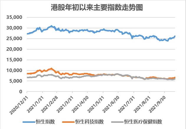 今年以来,港股市场波动较大。恒生指数从2月17日最高点31,085点跌至10月6日最低点23,966点,下跌7118点,跌幅23%,尤其科技股和医疗医药股的股价均出现较大波动。数据显示,年初至10月6日,恒生科技指数跌幅达30%;恒生医疗保健指数跌幅也达16%。