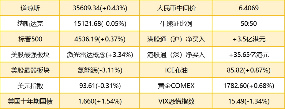 1. 隔夜美股截至收盘,道琼斯指数收盘上涨152.03点,涨幅0.43%,报35609.34点;标普500指数收盘上涨17.96点,涨幅0.40%,报4537.59点;纳斯达克综合指数下跌7.4点,跌幅0.05%,报15121.7点。港股ADR指数下跌,按比例计算,收报26085点,跌50.81点或0.19%。