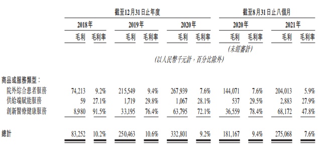 不同于京东健康、思派,圆心科技的业绩贡献更多侧重在院外综合患者服务。2018至2020年度,以及去年和今年前8个月分别为,圆心科技的毛利率分别10.2%、10.6%、9.2%、9.4%以及7.6%,所得毛利分别是0.83亿元、2.50亿元、3.33亿元、1.81亿元以及2.75亿元。