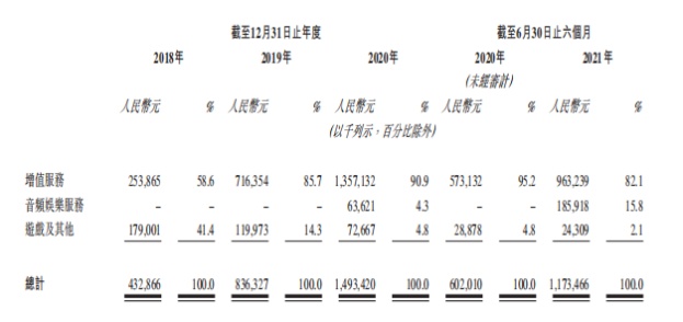 具体来看,经营互动在线平台业务可细分为增值服务及音频娱乐服务。增值服务是用户利用平台的互动功能,在多用户互动场景下购买和赠送虚拟礼物,以区分他们的虚拟角色,发展长期关系,即用户之间的相互赠送;音频娱乐服务则是用户将虚拟礼物赠送给提供音频娱乐的主播和工会。2018年至2021年前六个月止,增值服务实现收入2.54亿元、7.16亿元、13.57亿元、9.63亿元,占总营收比例分别为58.6%、85.7%、90.9%、82.1%;音频娱乐服务从2020年开始经营,收入从2020年的6362.1万元迅速升至2021上半年的1.86亿元,占总营收比例从2020年的4.3%至2021年上半年的15.8%。
