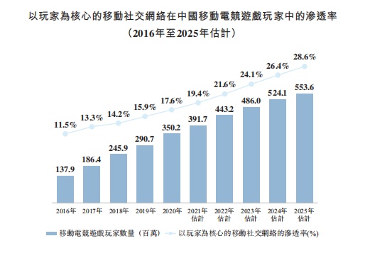 在移动电竞游戏日益普及和娱乐需求增强的推动下,预计到2025年,中国移动电竞游戏玩家的数量将增至5.54亿,占中国移动互联网用户人口的45.1%。以玩家为核心的移动社交网络平台在中国移动电竞游戏玩家中的渗透率在2020年达到17.6%,预计2025年将进一步增长至28.6%。