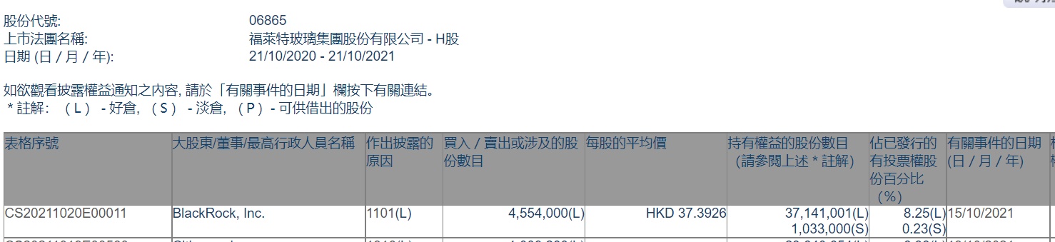 智通财经APP获悉,香港联交所最新资料显示,10月15日,贝莱德增持福莱特玻璃(06865)455.4万股,每股作价37.3926港元,总金额约为1.70亿港元。增持后最新持股数目约为3714.10万股,最新持股比例为8.25%。