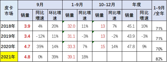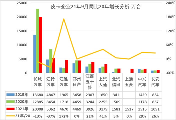 智通财经APP获悉,根据乘联会数据,2021年9月份皮卡市场销售4.8万辆,同比增长0.1%,环比增长39%。因为疫情后回暖较强,今年9月同比2019年同期增长26%。皮卡市场保持较强活力。2018年皮卡销量增长10%。2019年皮卡累计销量44万辆,累计同比下降3%。但2020年累计销量达到48万辆,同比增长9%。今年1-9月皮卡销量39万辆,同比增长18%。今年轻卡受治理超载刺激的增量驱动力逐步进入尾声,虽然2021年9月的皮卡0增长,但相对于传统轻卡的表现还是很强的。