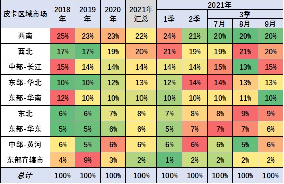 皮卡市场及销售区域方面。皮卡市场销售区域以西南为主,西部地区的皮卡需求较大。目前来看,西南、西北地区的皮卡需求占到总体需求的40%以上,成为两大核心市场。西部市场近期保持相对稳定的态势并没有明显的收缩特征。而目前增长相对比较快的是华北地区和中部黄河地区的皮卡市场,包括东北地区也有明显的启动的特征。目前主要的销售区域还是在以中小城市和县乡市场为主,尤其是县乡市场目前的表现相对来说还是相对较强。今年1-9月的县乡市场表现尤其突出。而中型城市市场保持稳定,大城市市场目前来看并没有明显的突破特征。