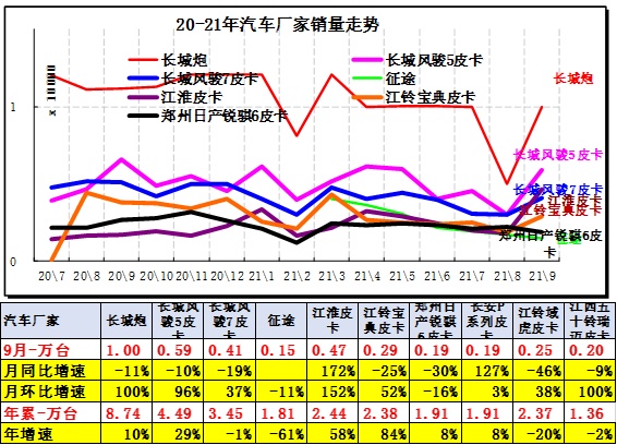 皮卡于中国市场的竞争情况分析,2021年皮卡市场主力厂商表现较好,长城汽车(02333)皮卡保持平稳的绝对优势地位,江铃汽车主力地位稳定。江淮汽车产销表现突出,郑州日产等保持平稳,上汽通用五菱新品快速走强。9月的福田汽车、长安汽车等表现相对较稳,上汽大通、江西五十铃等出现较大增长。今年1-9月长城皮卡份额43%,江铃汽车、郑州日产、江西五十铃等其他三家份额是30%,上汽通用五菱皮卡快速崛起,后面一些厂商的总体份额是近25%。形成头部企业挤压尾部企业销量的特征。