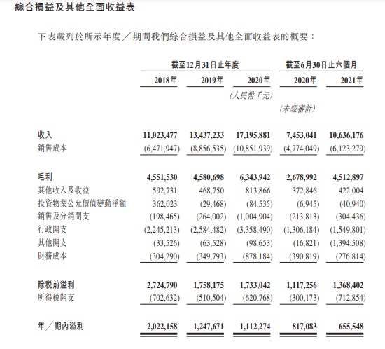 招股书显示,截至2018年、2019年、2020年12月31日及2021年6月30日止,万达商业的收入分别为110.24亿元(单位:人民币,下同)、134.37亿元、171.96亿元和106.36亿元。