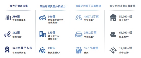 万达商业是中国最大的商业运营服务提供商,也是行业中科技驱动的商业管理和数字化运营的先驱,主要专注于商业广场。其商业运营服务包括:(i)商业管理服务、 (ii)物业管理服务,及(iii)增值服务。万达商业为业主提供全流程的商业运营服务,为商户带来大量客流并进行营销赋能,同时满足消费者的综合消费需求。截至2021年6月30日,公司管理380个商业广场,在管建筑面积达54.2百万平方米。于2018年、2019年及2020年,公司的在管商业广场(不包括停车位)平均出租率为98.8%。截至2021年6月30日,共有162个储备项目,包括133个独立第三方项目。