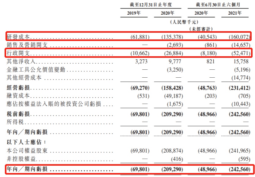 据招股书数据显示,2019年至2021年上半年,该公司的研发成本分别为0.62亿元、1.35亿元及1.6亿元,呈不断扩大之势;期内行政开支则分别为0.11亿元、0.27亿元、0.52亿元,亦不断增加。而随着商业化的步伐加快,其营销开支,今年上半年销售及营销开支就有1400多万,同比增幅逾16倍。