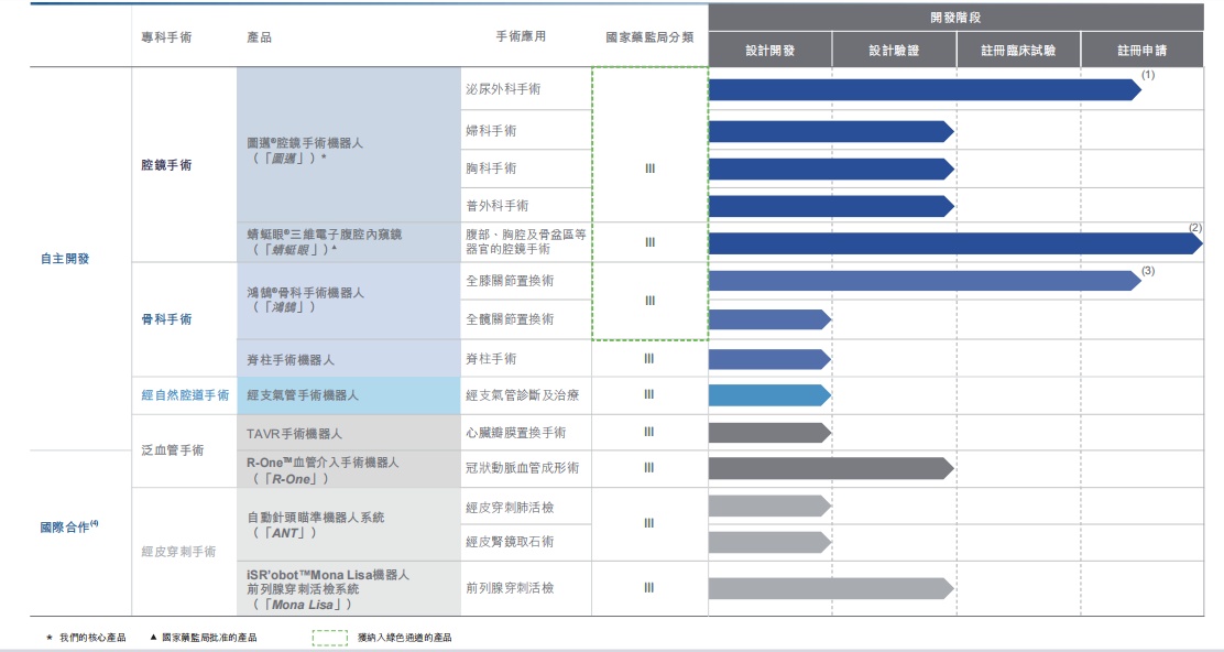 据弗若斯特沙利文资料,微创医疗机器人是全球行业中唯一一家拥有覆盖五大主要手术专科(即腔镜、骨科、泛血管、经自然腔道及经皮穿刺手术)产品组合的公司,目前其核心产品图迈、鸿鹄、蜻蜓眼均已被纳入国家药监局的创新医疗器械特别审查程序。其中,图迈及鸿鹄处于注册批准阶段,而蜻蜓眼已于最近获得国家药监局批准。除旗舰产品外,该公司亦有六款处于不同发展阶段的在研产品。