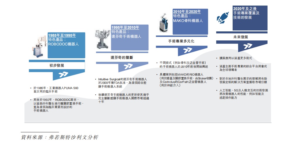 据智通财经APP了解,经过这么多年的发展,手术机器人现在主要用于五个快速增长的主要外科领域,即腔镜手术机器人 、骨科手术机器人、泛血管手术机器人、经自然腔道手术机器人、经皮穿刺手术机器人。需要指出的是,微创医疗机器人便是全球唯有一家拥有覆盖五大主要手术专科的医疗器械公司。