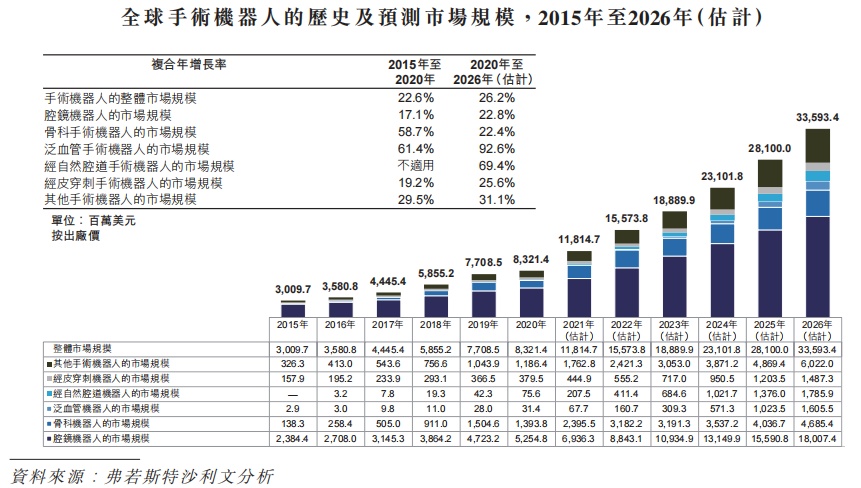 近年来,全球手术机器人市场蓬勃发展。据弗若斯特沙利文的资料显示,其由2015年 的30亿美元增至2020年的83亿美元,复合年增长率为22.6%。预期全球手术机器人市场将 继续快速增长,并可能于2026年达到336亿美元,自2020年起的复合年增长率为26.2%。